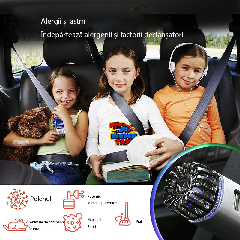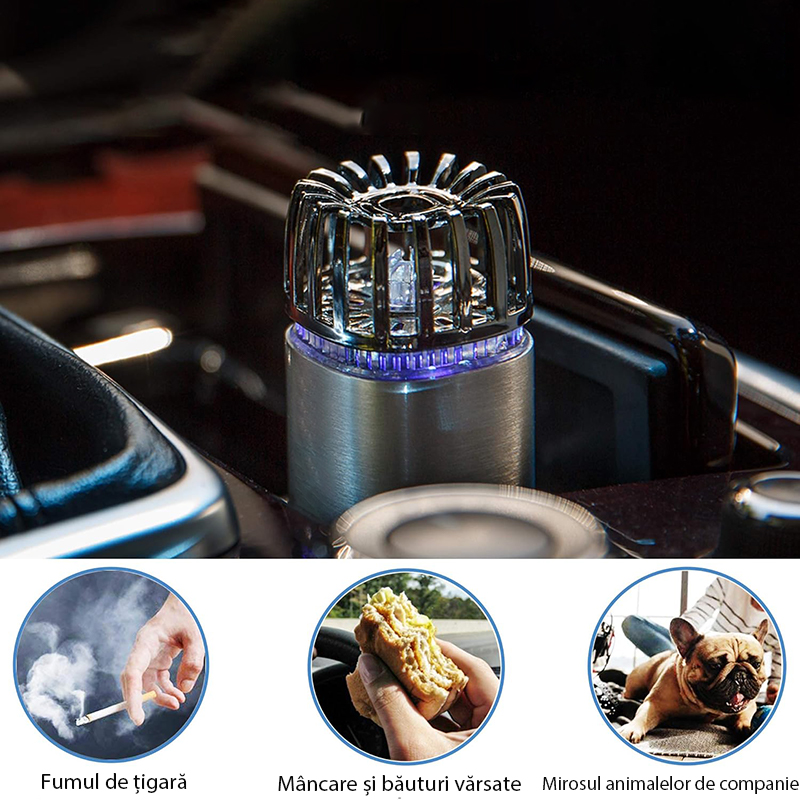 Hordozható autós légtisztító, Rqiurpn, szűrő nélkül, allergén- és szageltávolító, 12V, dupla USB töltő, matt ezüst