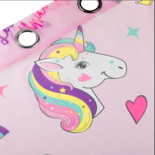 Varrott függöny, ETK, unikornis mintás, rózsaszín, fém gyűrűk, 140x260 cm