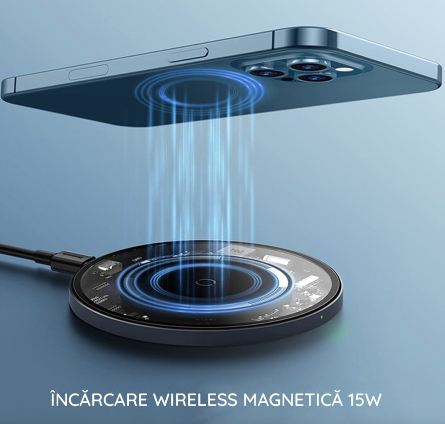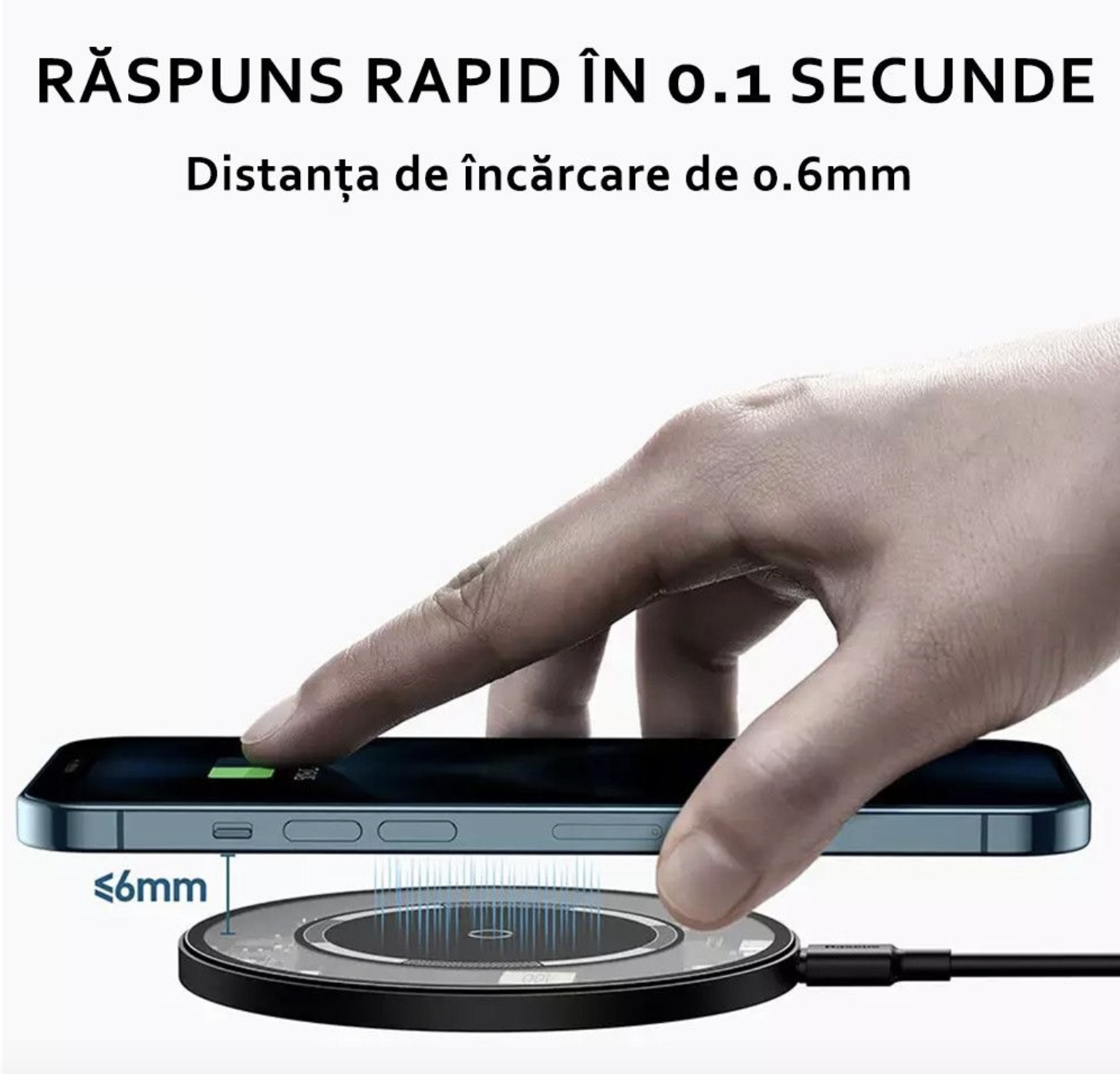 Mágneses vezeték nélküli töltő MagSafe WaltStore® technológiával, 15 W gyorstöltés, iPhone 15/14/13/12, AirPods Pro, Samsung, Huawei, LG, fekete