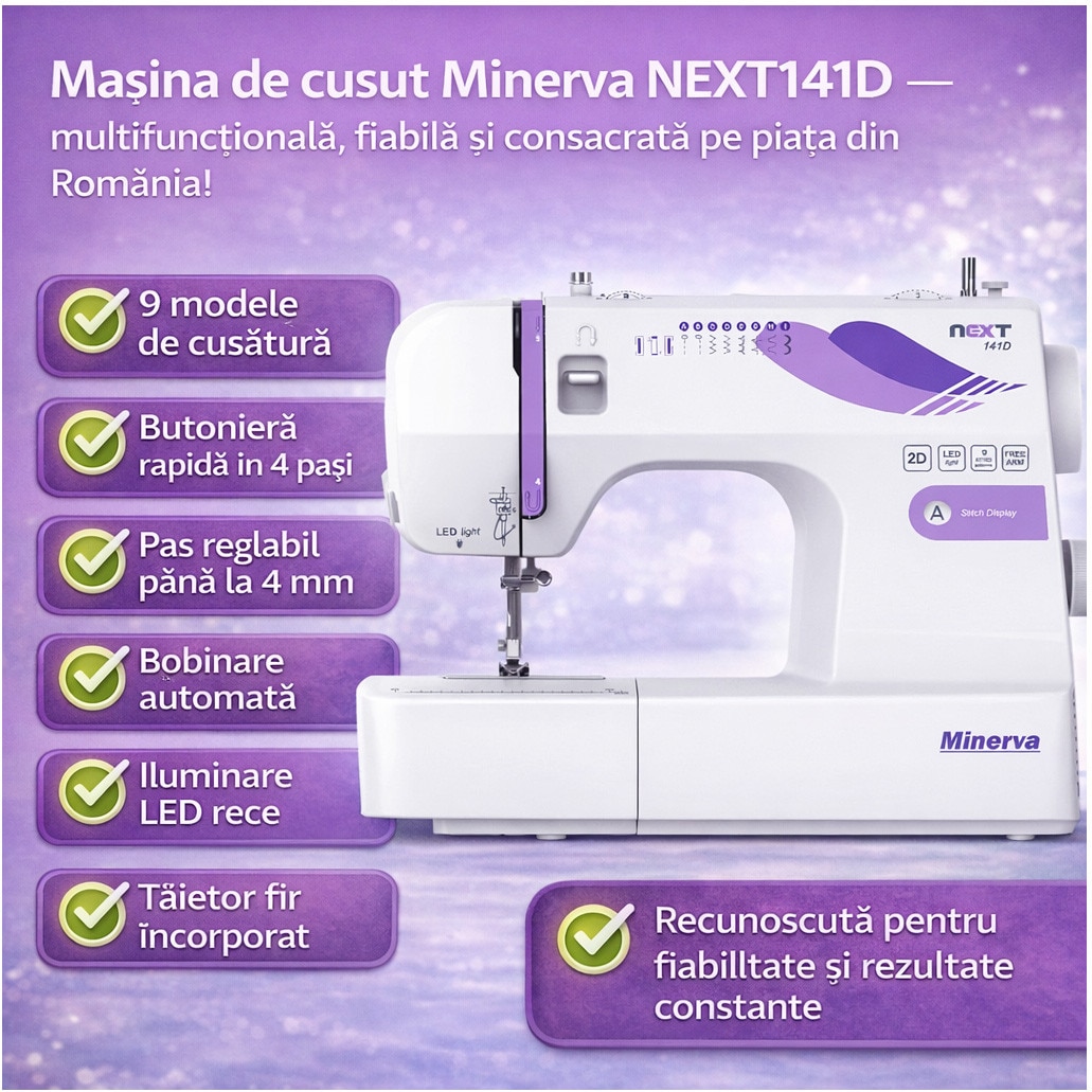 Minerva Next141D varrógép, 14 program, 850 öltés/perc, Fehér/Mályva