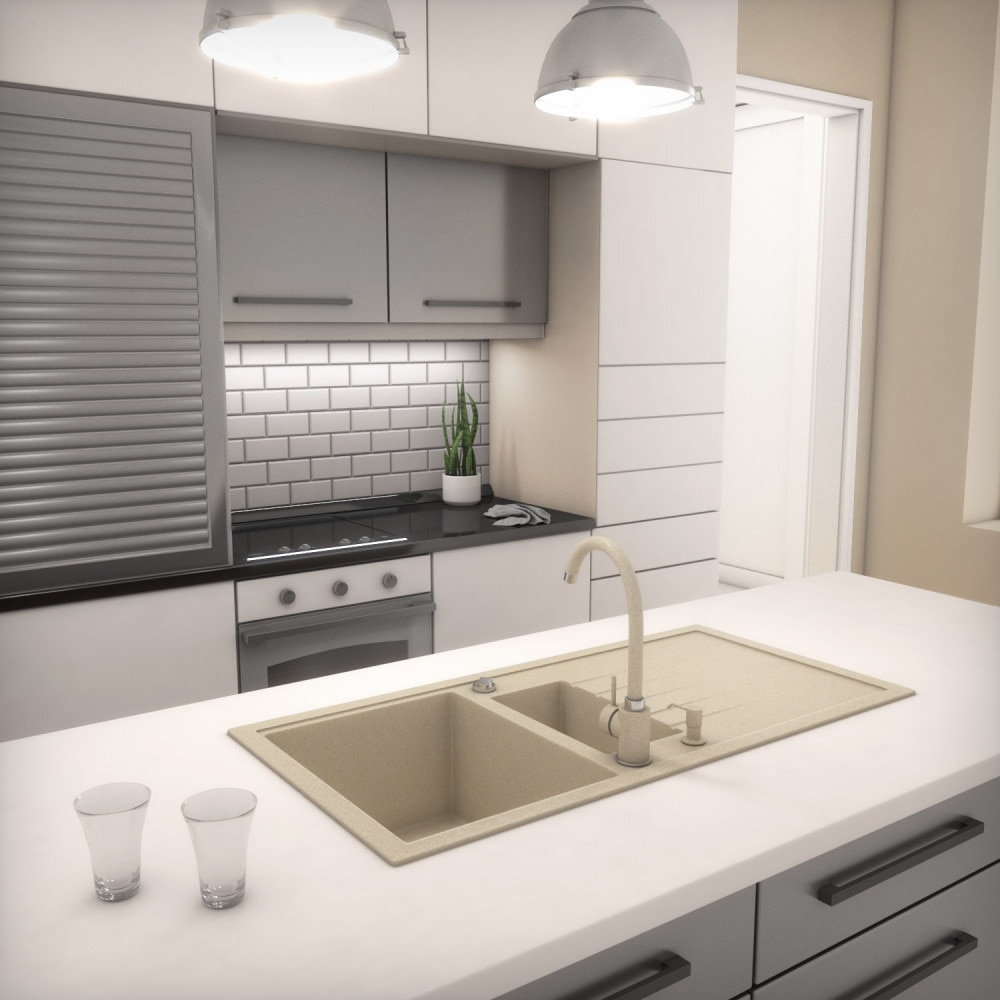 Nero Solarys, Gránit mosogató szett, Design csapteleppel és szifonnal, 99, 5 cm, Bézs