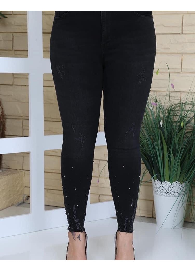 Női farmernadrág, plus size, slim fit, strasszokkal, fekete - 42-es méret (US 30)