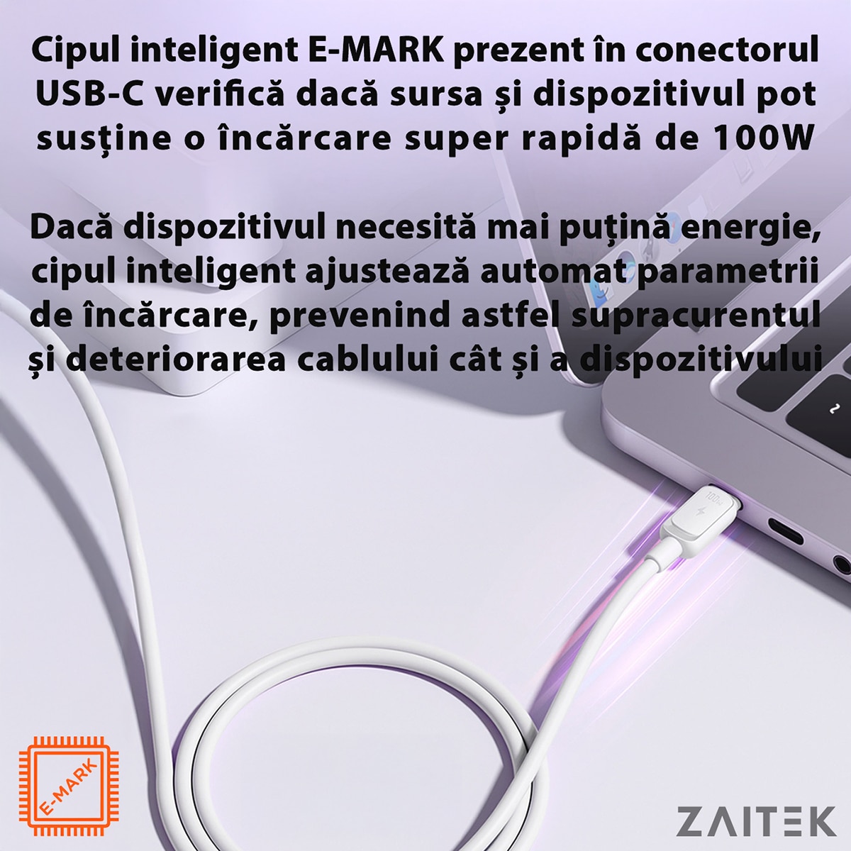 Az E-MARK chip egy intelligens vezérlő, amely szabályozza és kezeli az USB-C kábelen keresztüli áramáramlást, így biztosítja a kompatibilitást és a nagy teljesítményű, például 100 W (20 V/5A) töltés biztonságát.