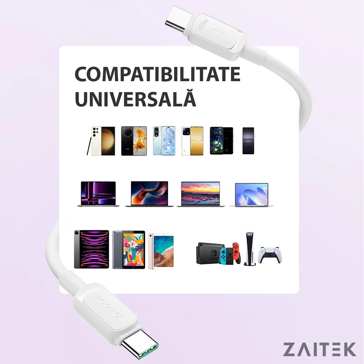 Az USB-C–USB-C kábel, 100 W-os PD 3.0 PRO, Android Auto / Apple Car Play, 1,2 m, fehér, Joyroom Plati, univerzális kompatibilitás a szupergyors töltéssel a legjobb megoldás eszközei hatékony és gyors táplálására. Ez a kiváló minőségű kábel univerzális kompatibilitást kínál, mivel az USB Type C portot használó eszközök széles körének töltésére készült.